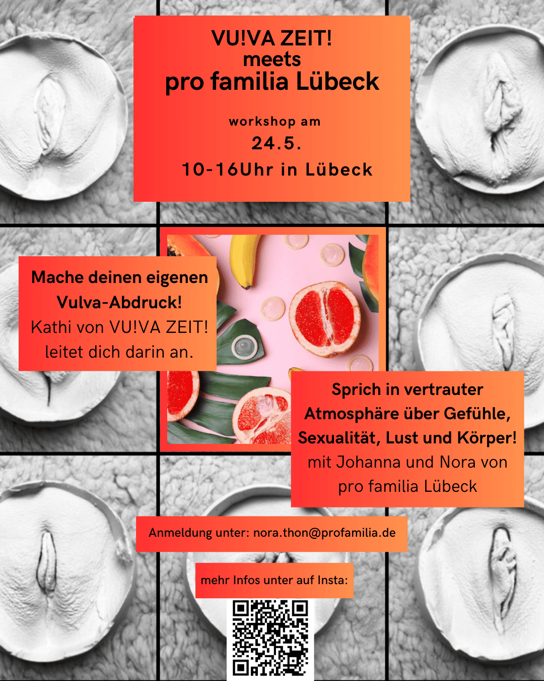 Pro Familia Lübeck und ich bieten am 24.05.25 den ersten gemeinsamen Workshop an. Wir sind sehr glücklich und aufgeredet diesen kreativen Raum zu schaffen indem auch über Körper, Sexualität und Selbstwahrnehmung gesprochen wird.